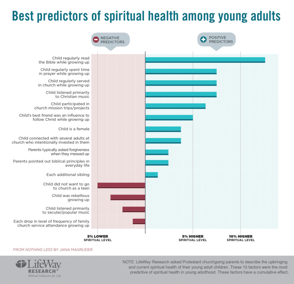 Parents’ behavior is also related to their adult children’s spiritual health, LifeWay Research found. Young adults had higher spiritual health scores if they grew up with parents who spent time: